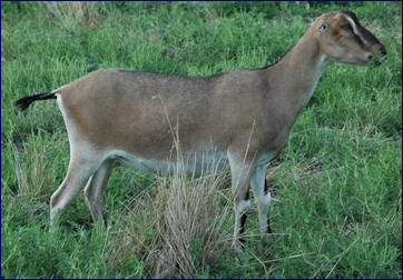 Voila's outstanding depth of body and wedge-shape along with upstandingness is simply tremendous as an aged doe. She does have weakened pasterns that have  persisted as a result of her severe toxemia in 2016.